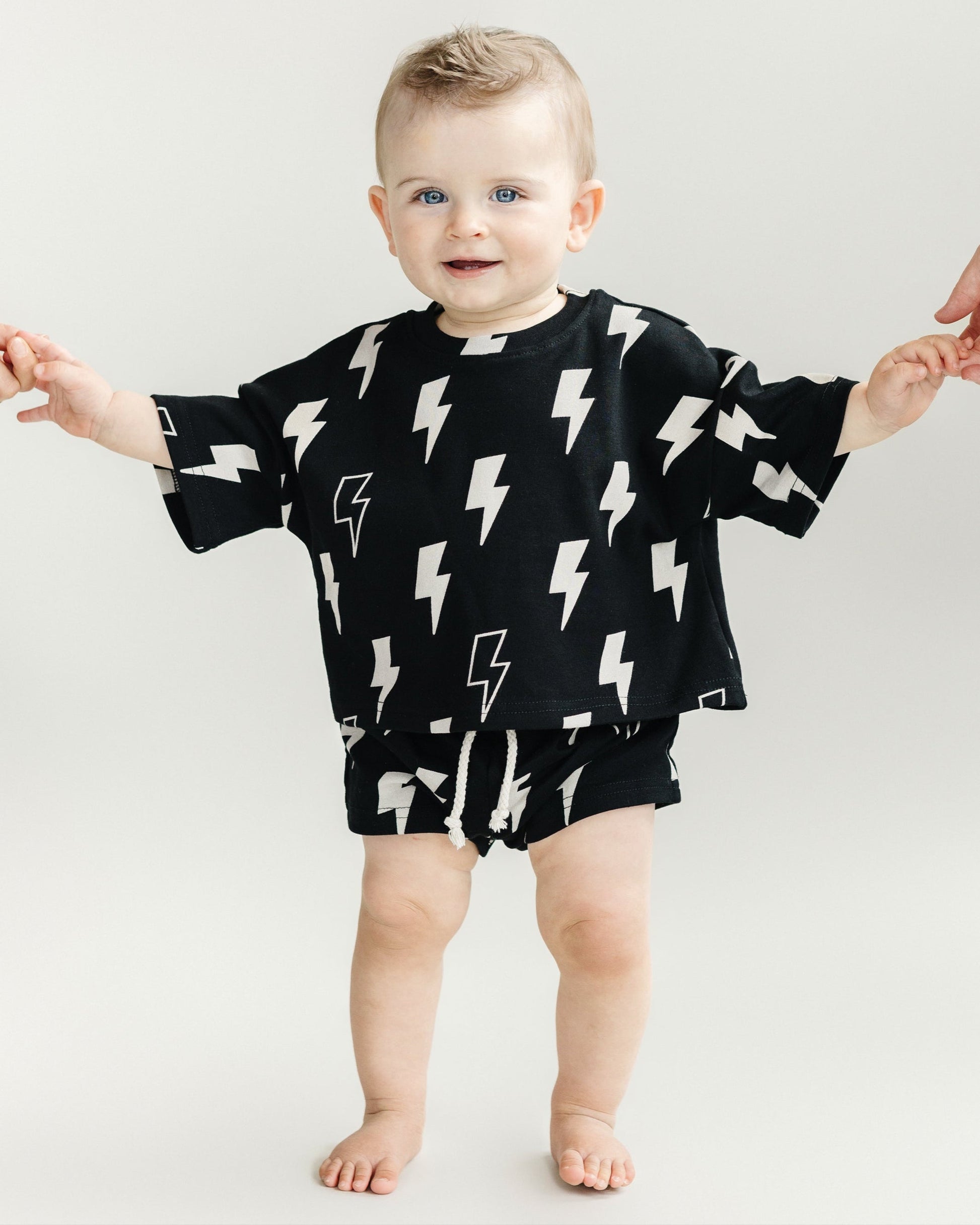 This shorts set is made of high-quality cotton and boasts a trendy lightning bolt design. The set comes with an oversized top and true to size shorts in sizes NB-9Y. The material is 95% cotton and 5% spandex for maximum comfort.